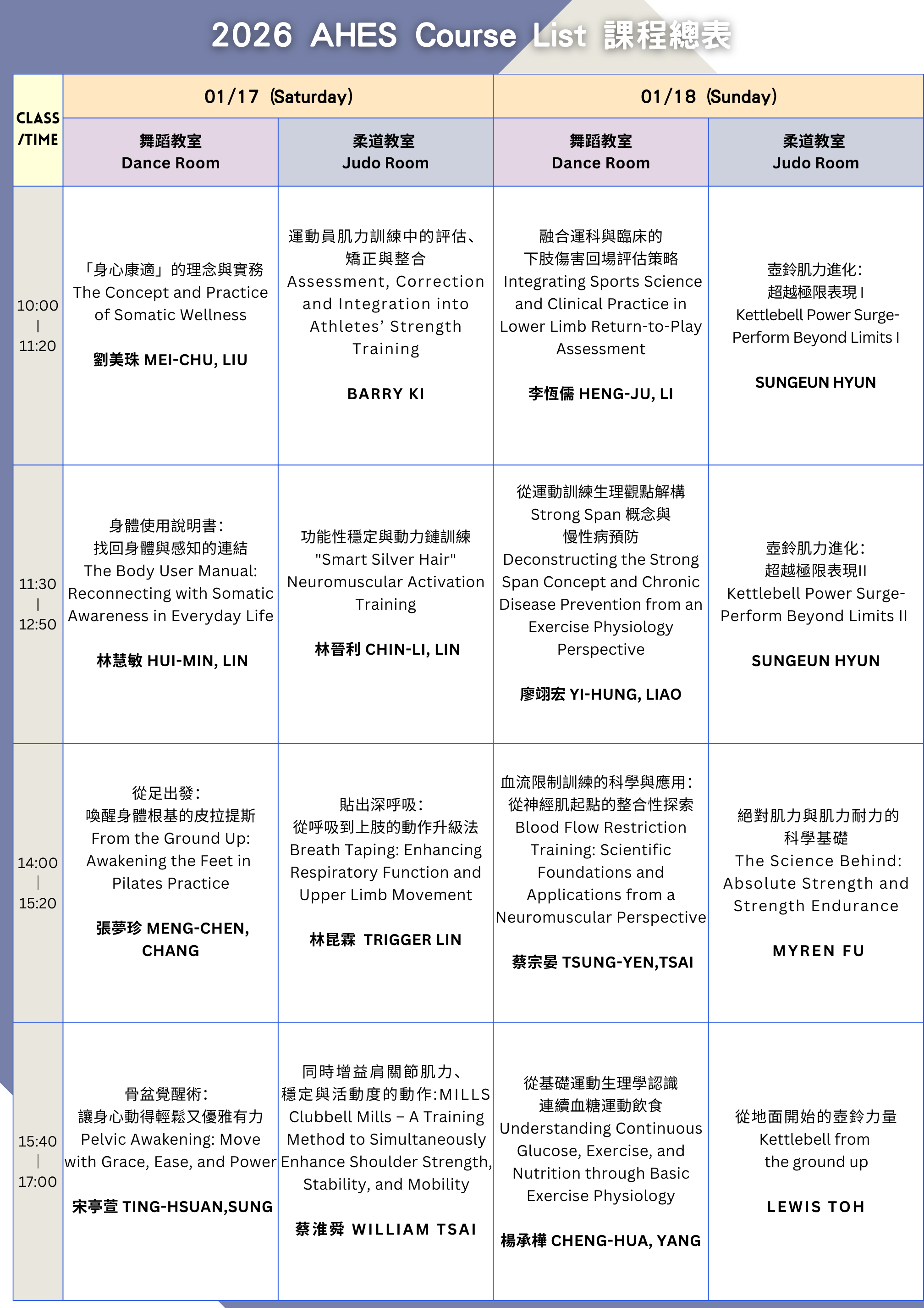 無論您是健康照護專業人士、運動教練、療癒工作者,或是關心健康生活的一般民眾,AHES 都將是您吸收最新知識、提升實務技能、拓展國際人脈的最佳平台。
